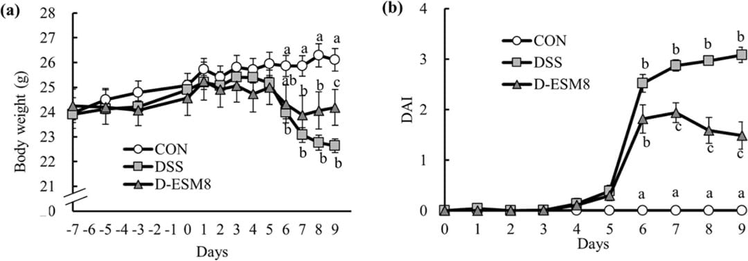 卵殻膜の薬物動態を³H標識で追跡し、炎症性腸疾患モデル(DSS誘導大腸炎)における腸病変および腸内細菌叢への影響を調べた結果、卵殻膜およびその主要タンパク質であるリゾチームは腸の炎症や症状を抑え、さらにヒトへの摂取では善玉菌の増加を示し、腸内環境改善と抗炎症の可能性が示唆されました。