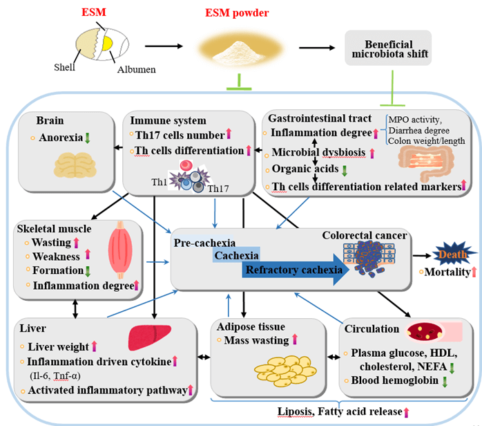 卵殻膜の摂取により、筋肉量の維持や脂肪組織量の改善、炎症関連遺伝子発現の抑制、腸内細菌多様性の改善および短鎖脂肪酸(特に酪酸)の増加が認められ、プレ・カヘキシア症状の進展を抑える可能性を確認しました。